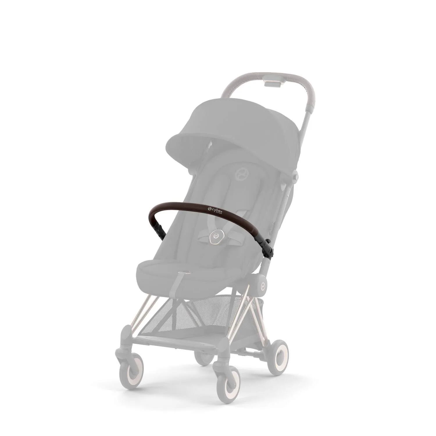Encaixe a barra de apoio de braços no seu carrinho Coya até ouvir um clique para obter ainda mais conforto em viagens grandes e pequenas.